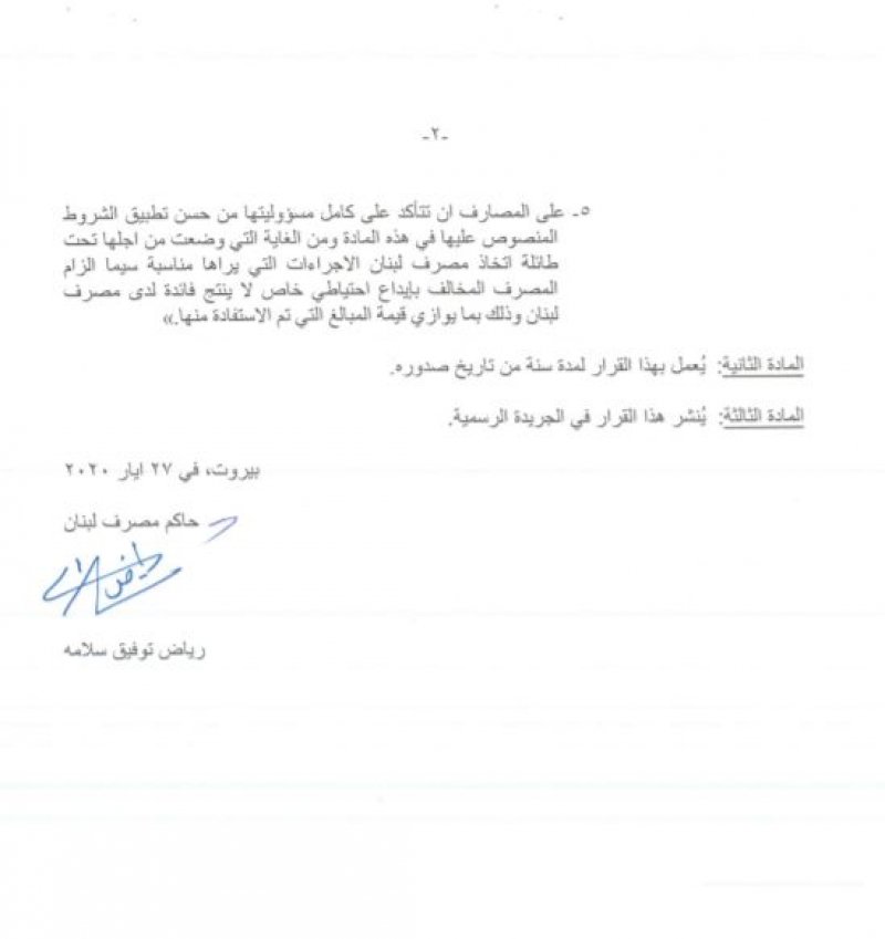 أصدر حاكم "مصرف لبنان" رياض سلامة تعميماً بشأن التسهيلات الممكن أن يمنحها مصرف لبنان للمصارف وللمؤسسات المالية".