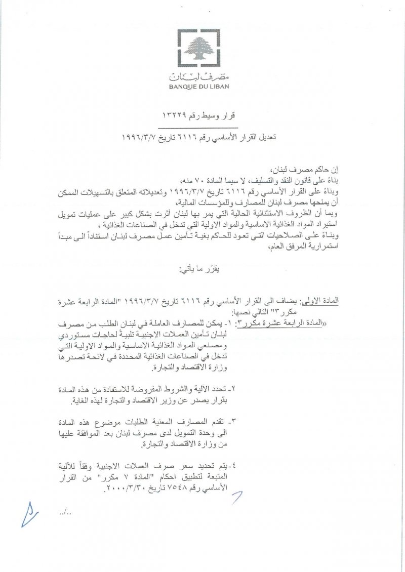 أصدر مصرف لبنان تعميما بشأن التسهيلات للمصارف وللمؤسسات المالية في ما يتعلق باستيراد المواد الغذائية الاساسية.