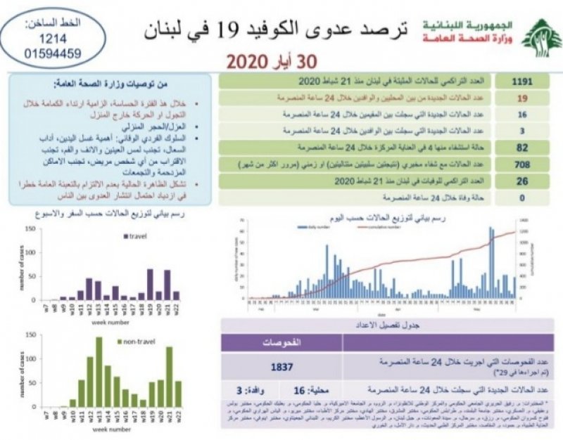 وزارة الصحة اللبنانية: 19 إصابة جديدة بفيروس كورونا خلال الـ 24 ساعة الماضية ليصبح إجمالي الإصابات 1191