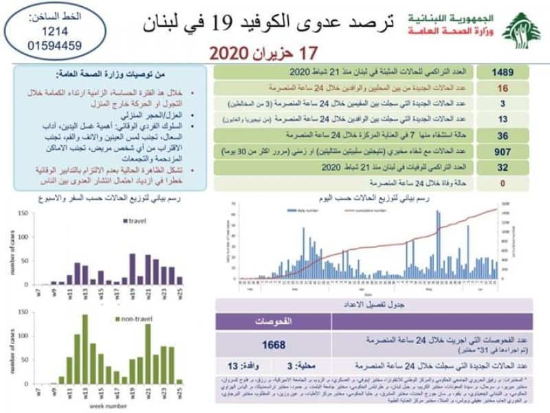 وأفاد التقرير عن تسجيل 16 إصابة جديدة بالفيروس، 13 لوافدين إلى لبنان و3 لمقيمين، ليبلغ مجموع الإصابات