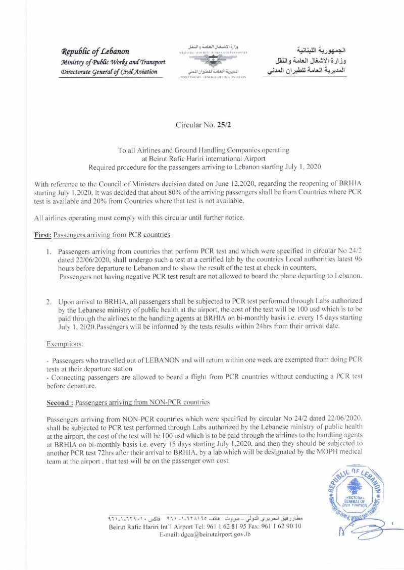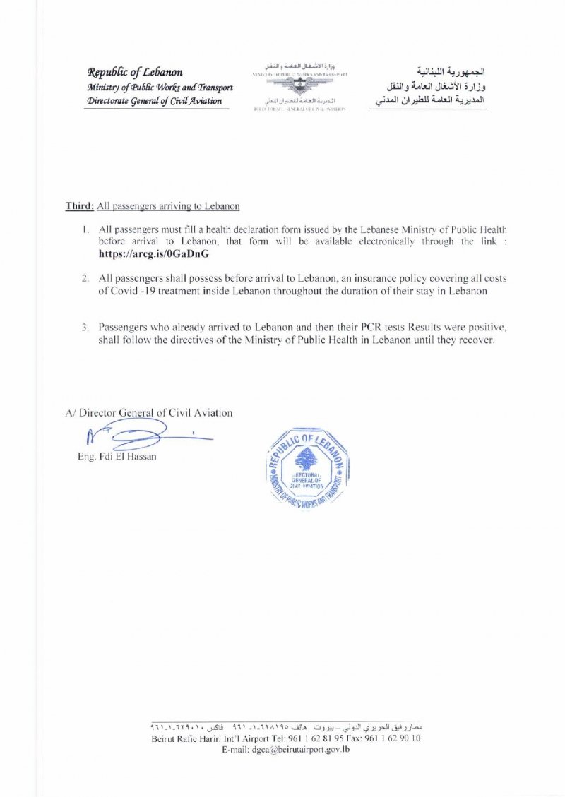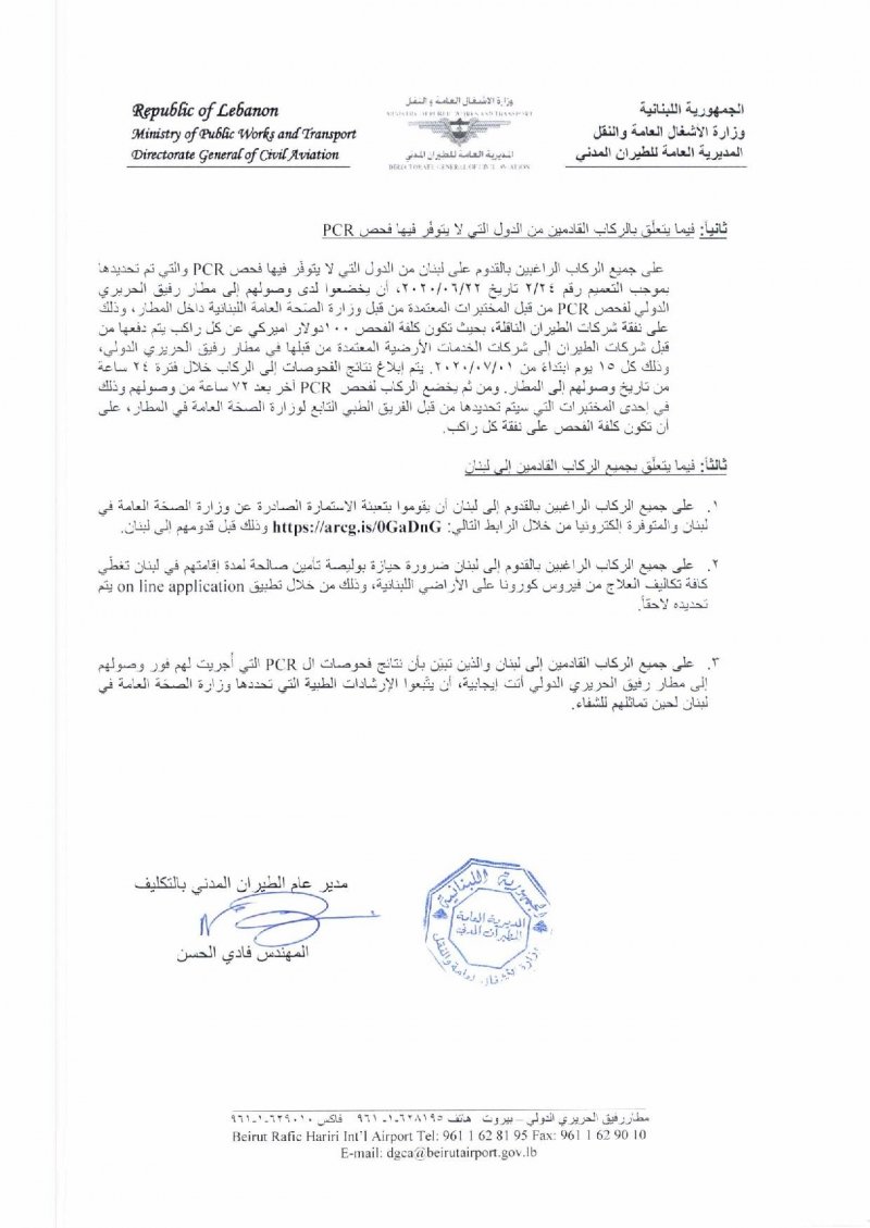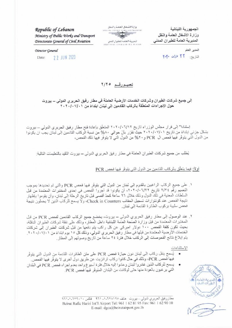 أصدر المدير العام للطيران المدني بالتكليف في مطار بيروت المهندس فادي الحسن تعميما حمل الرقم 2/25 إلى كل شركات الطيران وشركات الخدمات الأرضية العاملة في المطار حول الإجراءات المتعلقة بالركاب القادمين إلى لبنان ابتداء من 1 تموز، جاء فيه: