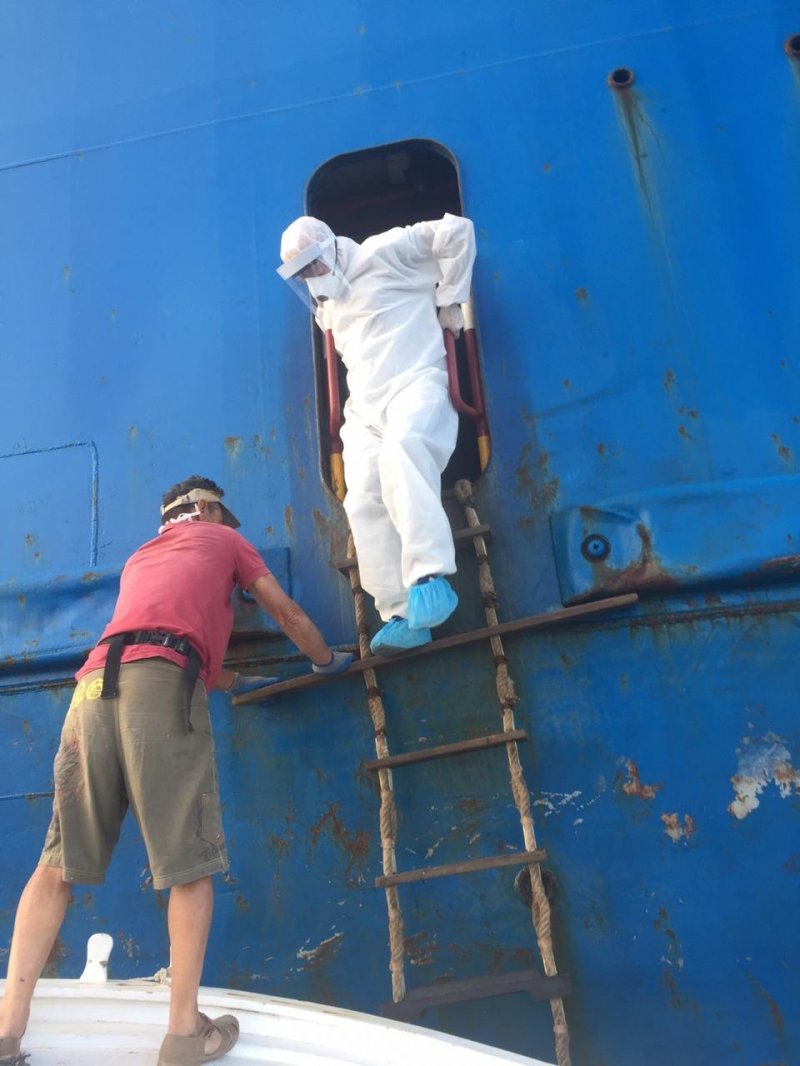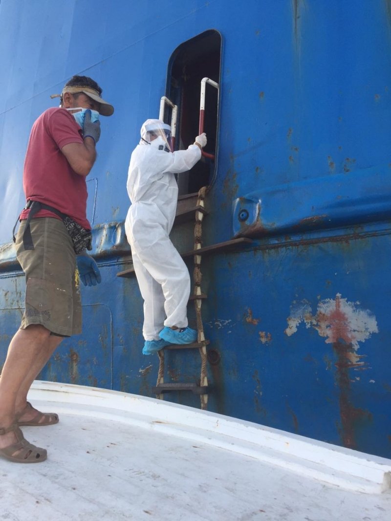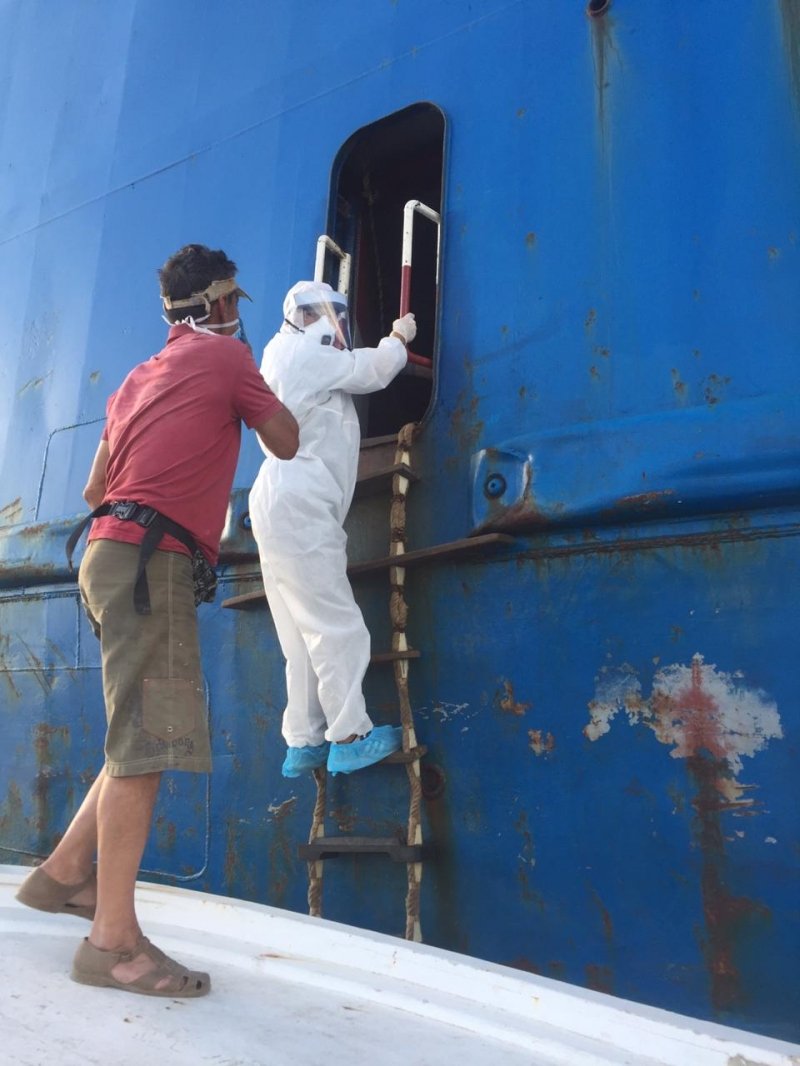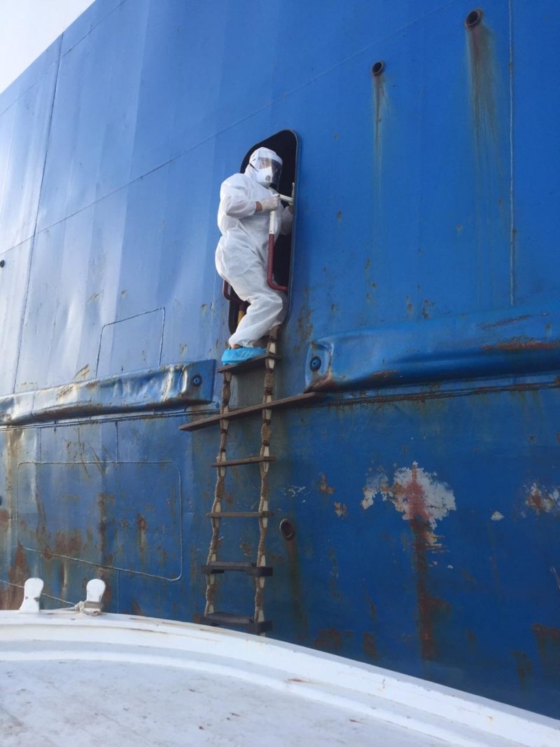 ضمن مجهود وزارة الصحة في ضبط الوضع ومنع انتشار الوباء..كشف المراقب الصحي في دائرة الحجر الصحي في مرفأ صور (محمد بيضون) على الباخرة Nivine في عرض البحر قبل السماح لها بالرسو في حرم المرفأ