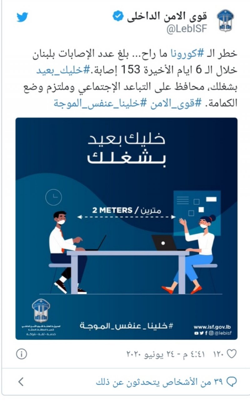 نشرت قوى الامن الداخلي عبر صفحتها على “تويتر” تغريدة وفيها: “خطر الكورونا ما راح…بلغ عدد الإصابات بلبنان خلال ال 6 ايام الأخيرة 153 إصابة. خليك بعيد بشغلك، محافظ على التباعد الإجتماعي وملتزم وضع الكمامة”.
