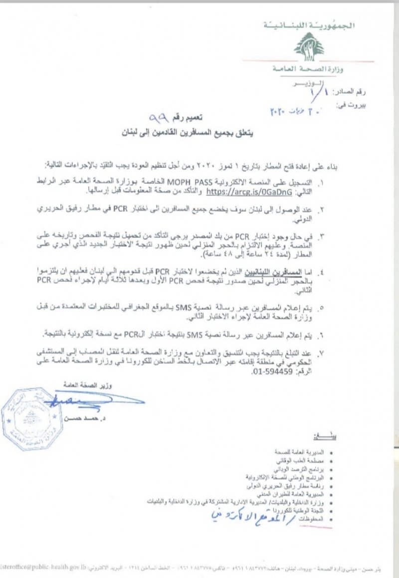 اصدرت "وزارة الصحة العامة" تعميما يتعلق بجميع المسافرين القادمين الى لبنان قبيل اعادة فتح مطار بيروت. ويدعو التعميم المسافرين القادمين الى التقيد بعدد من الاجراءات من اجل تنظيم العودة.