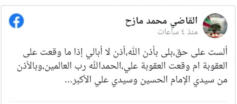 في أول تعليقٍ له بعد تقديم إستقالته،كتب قاضي الأمور المستعجلة في صور محمد مازح، عبر حسابه الخاص "فيسبوك": "ألست على حق، بلى بإذن الله، إذًا لا أبالي إذا ما وقَّعت على العقوبة ام وقعت العقوبة علي، الحمدالله رب العالمين، وبالإذن من سيدي الإمام الحسين وسيدي علي الأكبر".