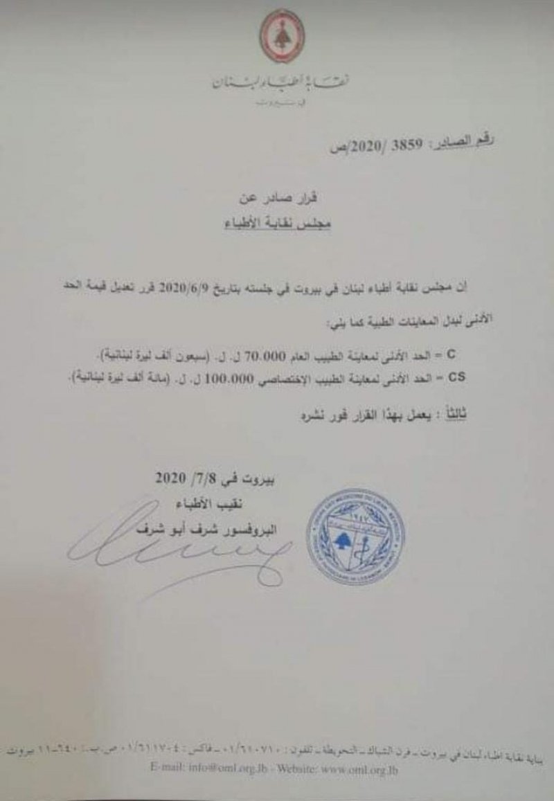 صدر عن مجلس " نقابة الأطباء " بيان يعدّل فيه الحد الأدنى لمعاينة الطبيب. وفي التفاصيل، رُفعت معاينة الحد الادنى للطبيب العام إلى 70 الف ليرة، مقابل 100 الف ليرة كحد أدنى لمعاينة الطبيب الاختصاصي.
