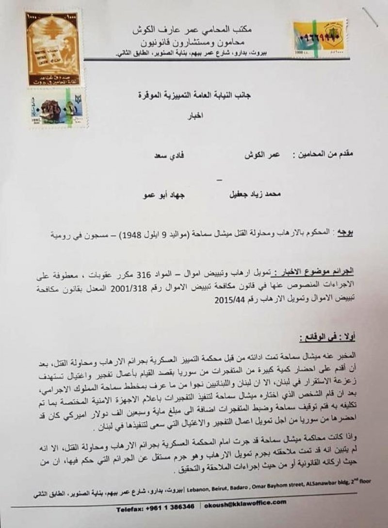 التمييزية في بيروت، ضد المحكوم الوزير السابق ميشال فؤاد سماحة، طالبين الإدعاء عليه وإحالته على
