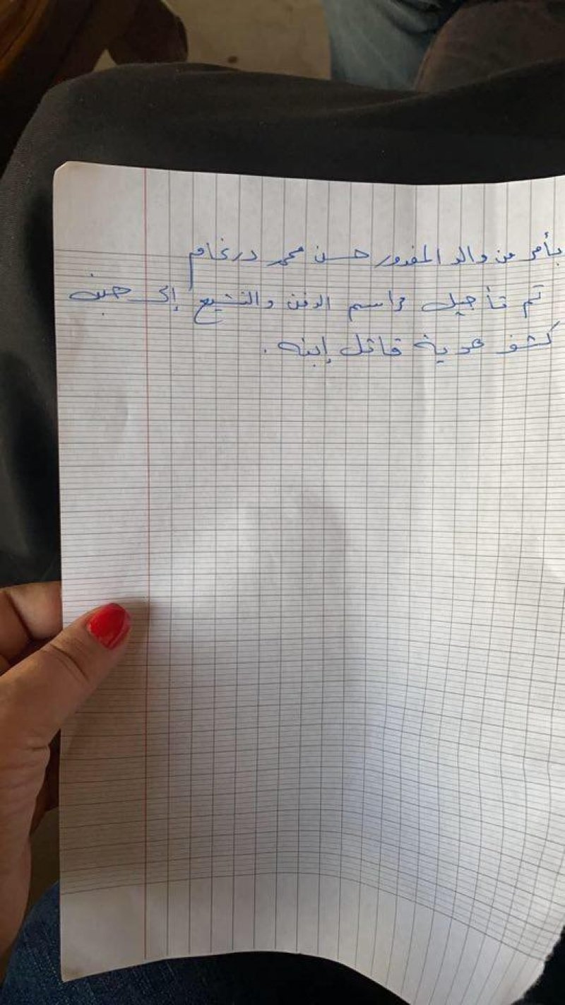 وطالب محمد سعيد درغام وهو والد الشاب المغدور، الجهات المختصة بالكشف عن هوية القتلة، مؤكداً أن نجله حسن، لم يمكن يحمل أي سلاح.