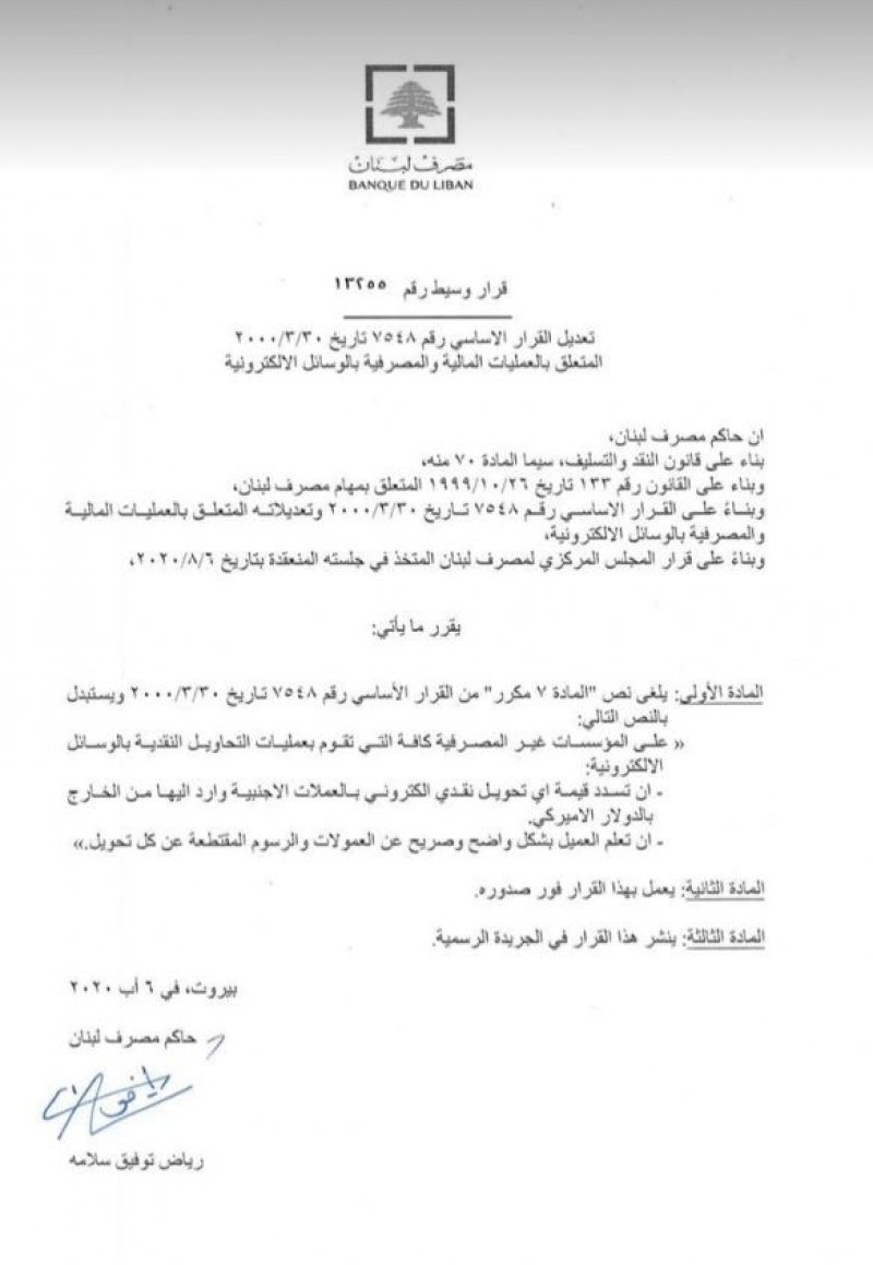وجاء في نص القرار: "المادة الأولى: يلغى نص "المادة 7 مكرر" من القرار الأساسي رقم 7548 تاريخ 30-3-200 ويستبدل بالنص التالي: "على المؤسسات غير المصرفية كافة التي تقوم بعمليات التحاويل النقدية بالوسائل الالكترونية أن تسدد قيمة اي تحويل نقدي الكتروني بالعملات الأجنبية وارد اليها من الخارج بالدولار الأميركي.