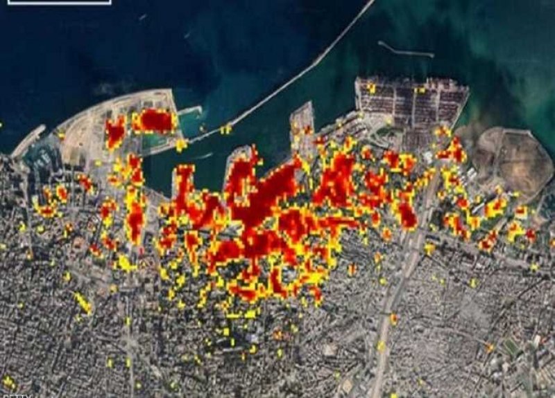 وعلى الخريطة المرفقة تمثل النقاط «البيكسلات» الحمراء الداكنة، مثل تلك الموجودة داخل وحول مرفأ بيروت، الضرر الأشد.
