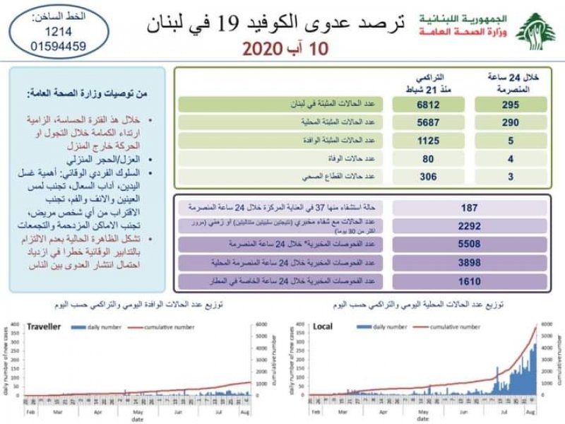 وزارة الصحة اللبنانية: تسجيل 295 إصابة جديدة بكورونا و4 حالات وفاة