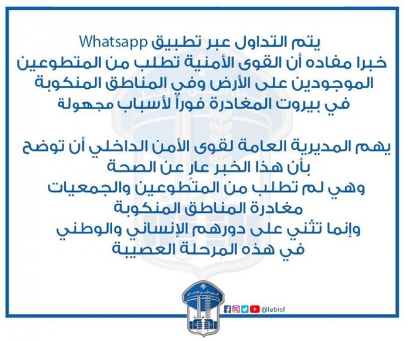 أعلنت قوى الأمن الداخلي في تغريدةٍ على حسابها عبر "تويتر"، أنه "يتم التداول عبر تطبيق "Whatsapp" خبراً مفاده أن القوى الأمنية تطلب من المتطوعين الموجودين على الأرض وفي المناطق المنكوبة في بيروت، المغادرة فورا لأسباب مجهولة"، يهم المديرية العامة، أن "توضح بأن هذا الخبر عار عن الصحة وهي لم تطلب من المتطوعين والجمعيات مغادرة المناطق المنكوبة، وإنما تثني على دورهم الإنساني والوطني في هذه المرحلة العصيبة قوى الأمن الداخلي".