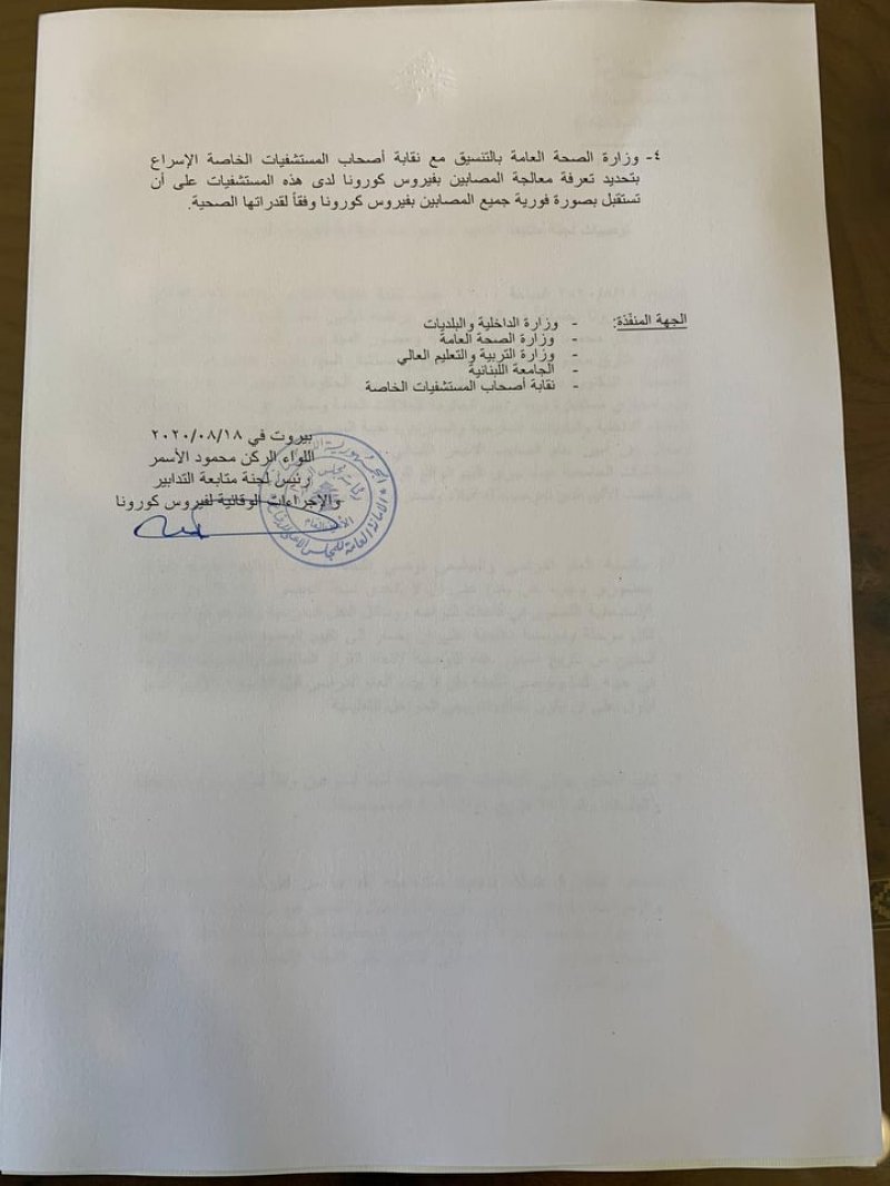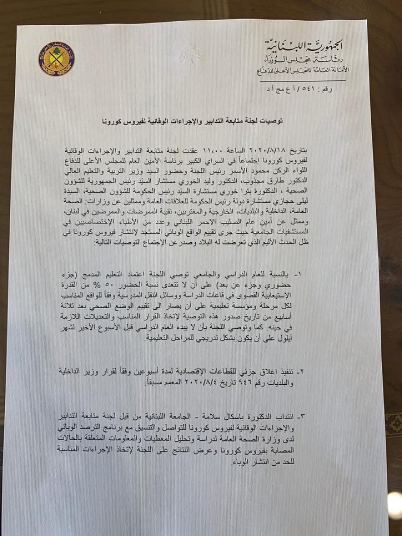 أوصت لجنة متابعة التدابير والاجراءات الوقائية لفيروس كورونا بتنفيذ إغلاق جزئي للقطاعات الاقتصادية لمدة أسبوعين وفقا لقرار وزير الداخلية والبلديات رقم 946 تاريخ 4-8-2020 المعمم مسبقا.