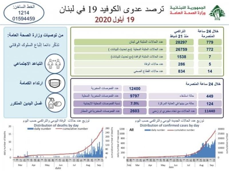 وزارة الصحة: 5 وفيات و 779 إصابة جديدة بالكورونا في لبنان