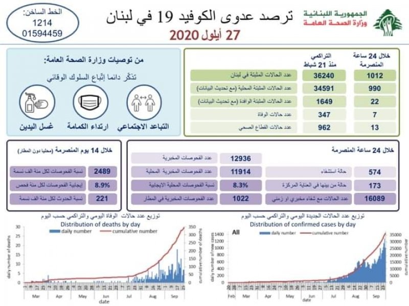 وزارة الصحة اللبنانية: تسجيل 7 حالات وفاة و1012 إصابة جديدة بفيروس #كورونا