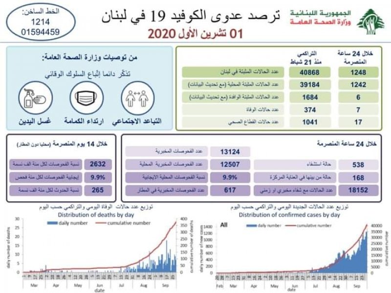 وزارة الصحة اللبنانية: "1248 إصابة جديدة بالكورونا في لبنان و7 حالات وفاة خلال 24 ساعة"