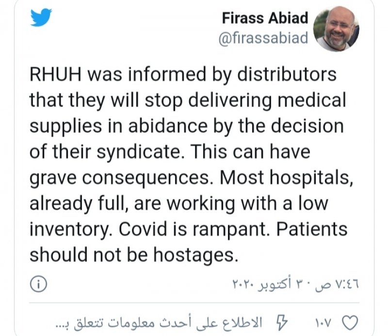اشار مدير مستشفى الحريري الحكومي الجامعي الدكتور فراس أبيض في تصريح له عبر حسابه على تويتر، الى انه تم إبلاغ مستشفى بيروت من قبل الموزّعين بأنهم سيتوقّفون عن تسليم المستلزمات الطبية امتثالاً لقرار نقابتهم.