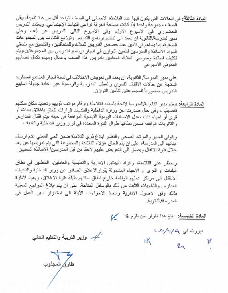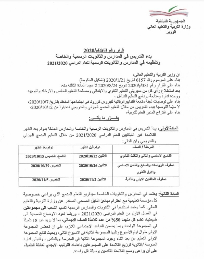 أصدر وزير التربية في حكومة تصريف الأعمال طارق المجذوب قرارا يقضي ببدء التدريس المدمج يوم الاثنين 12 تشرين الأول 2020 بالنسبة لصفوف التاسع الاساسي والثاني والثالث ثانوي.
