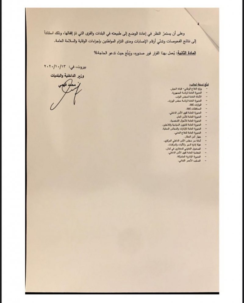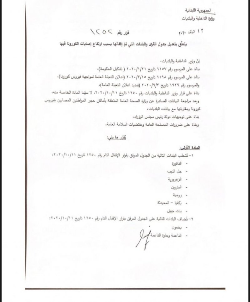 أصدرت وزارة الداخلية والبلديات، قرار 1252 يتعلّق بتعديل جدول القرى والبلدات التي تم إقفالها بسبب إرتفاع إصابات كورونا فيها.