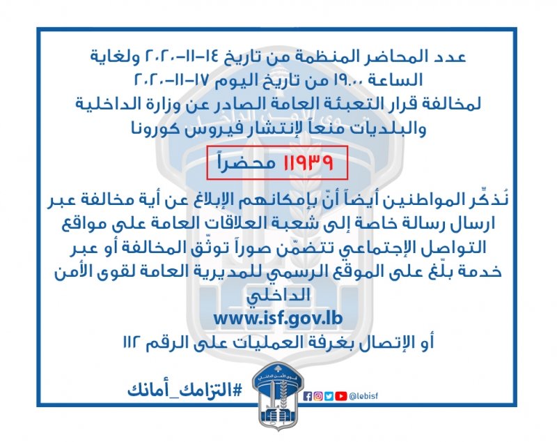 عممت قوى الامن الداخلي: "مجموع محاضر مخالفات قرار التعبئة العامة المنظمة إعتباراً من تاريخ 14-11-2020 ولغاية الساعة 19:00 من تاريخ اليوم 17-11-2020 منعاً لانتشار فيروس #كورونا #إلتزامك_أمانك #قوى_الأمن"