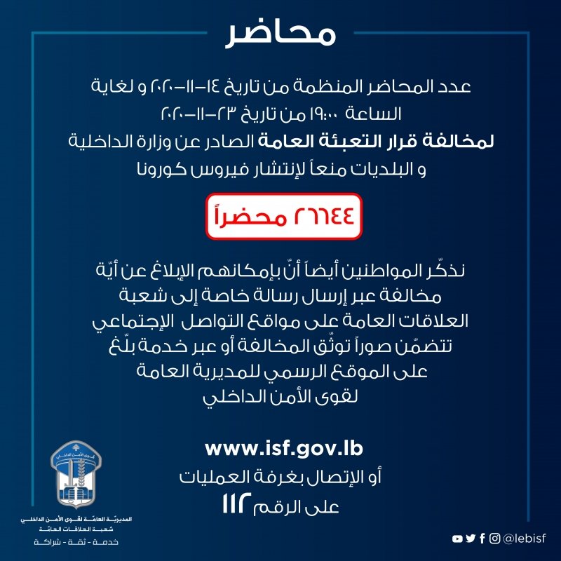عممت قوى الامن الداخلي: "مجموع محاضر مخالفات قرار التعبئة العامة المنظمة إعتباراً من تاريخ 14-11-2020 ولغاية الساعة 19:00 من تاريخ 23-11-2020 منعاً لانتشار فيروس #كورونا #إلتزامك_أمانك #قوى_الأمن