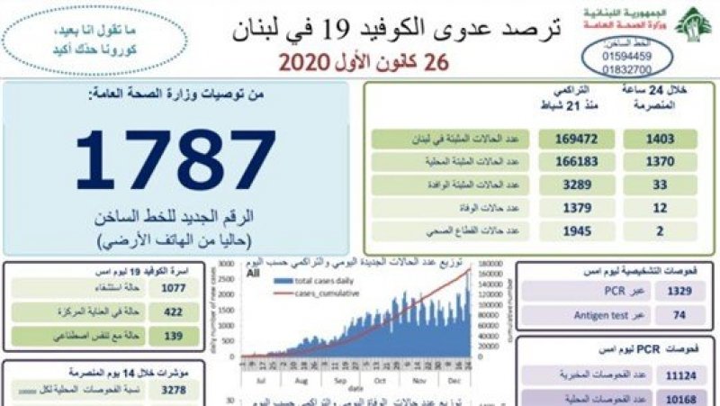 في لبنان.. 1403 إصابة جديدة بكورونا و12 حالة وفاة خلال الـ24 ساعة الأخيرة