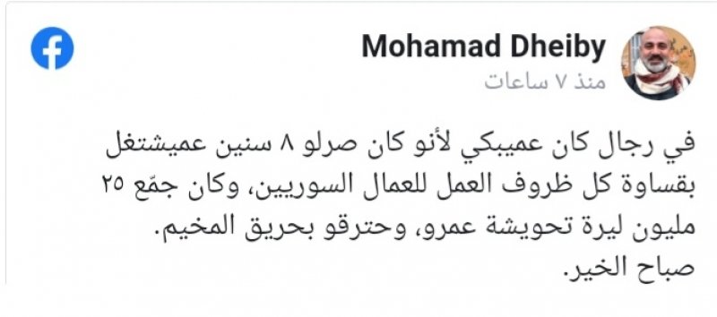 نشر ناشط يتابع أوضاع العائلات النازحة التي احترقت خيمها أمس في المنية حادثة مؤثرة حدثت معه قائلاً: "في رجال كان عميبكي لأنو كان صرلو ٨ سنين عميشتغل بقساوة كل ظروف العمل للعمال السوريين، وكان جمّع ٢٥ مليون ليرة تحويشة عمرو، وحترقو بحريق المخيم".