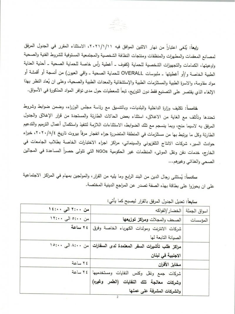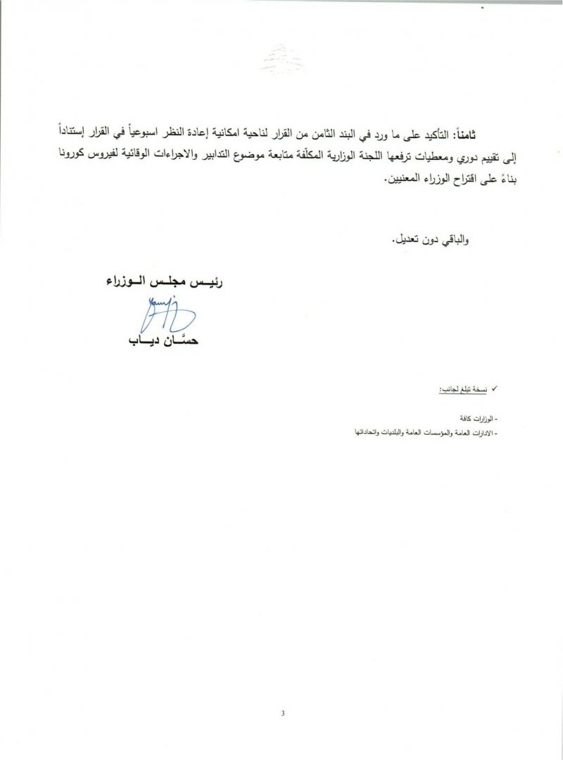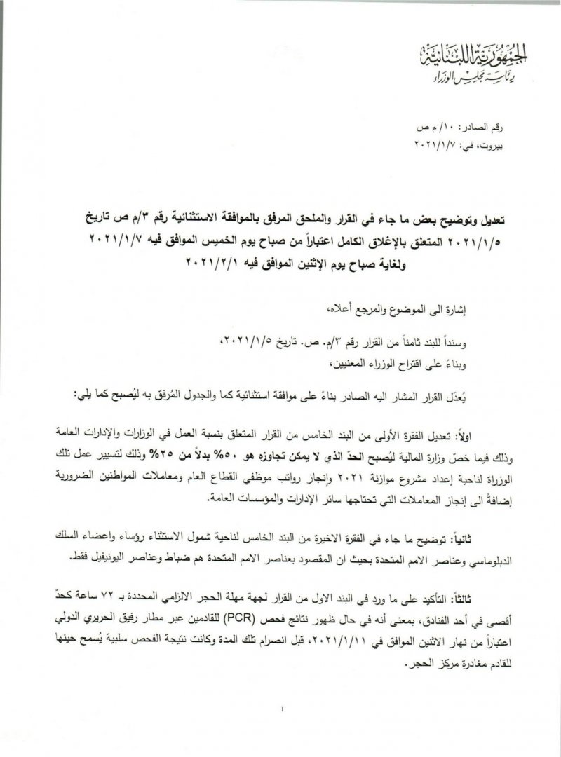 "صدر عن رئاسة مجلس الوزراء بيان يتعلّق بتعديل وتوضيح بعض ما جاء في القرار والمحلق المرفق بالموافقة الاستثنائيّة المتعلق بالاغلاق الكامل.