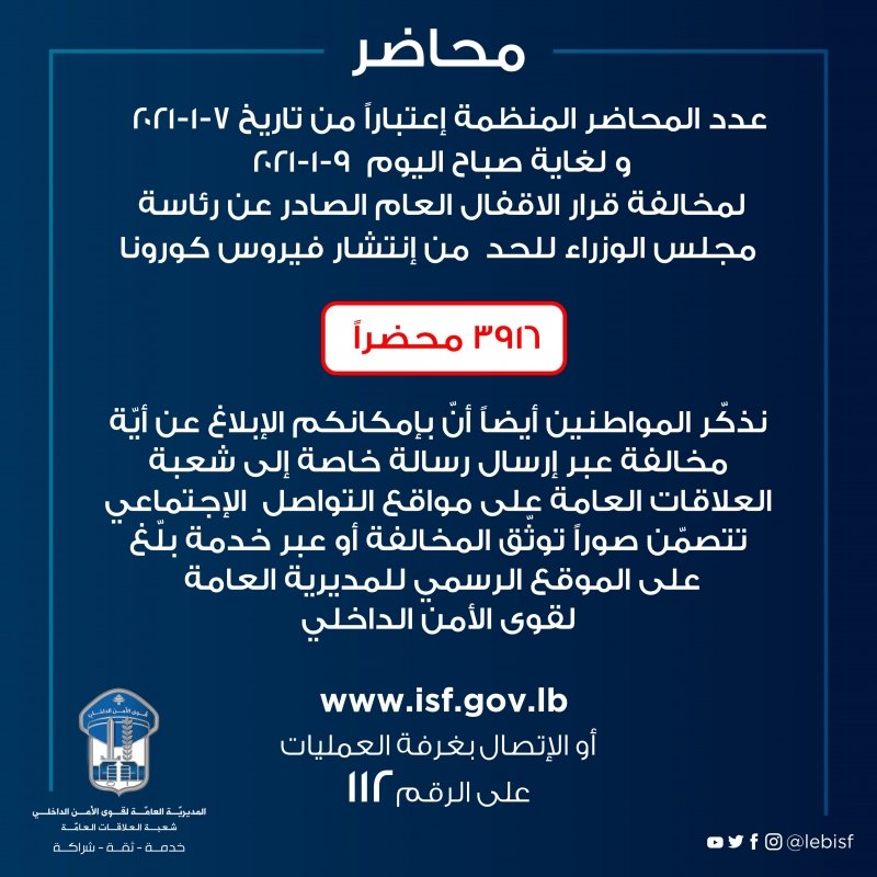اعلنت قوى الامن الداخلي: 3916مجموع محاضر مخالفات قرار التعبئة العامة المنظمة إعتباراً من تاريخ 7-1-2021 ولغاية صباح اليوم 9-1-2021 للحدّ من انتشار فيروس #كورونا #إلتزامك_أمانك #قوى_الأمن