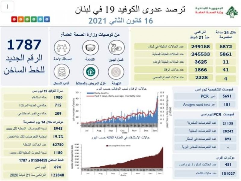 وزارة الصحة: "تسجيل" 5872 إصابة جديدة بكورونا و41 حالة وفاة
