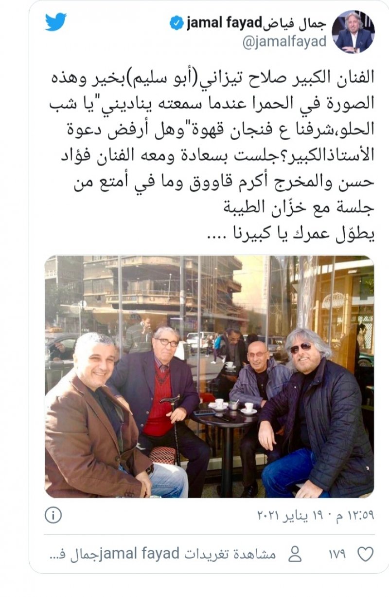 كما نشر الناقد والصحافي جمال فياض صورة له مع "ابو سليم" وأرفقها بالقول: "الفنان الكبير صلاح تيزاني (أبو سليم) بخير وهذه الصورة في الحمرا عندما سمعته يناديني"يا شب الحلو،شرفنا ع فنجان قهوة"وهل أرفض دعوة الأستاذالكبير؟جلست بسعادة ومعه الفنان فؤاد حسن والمخرج أكرم قاووق وما في أمتع من جلسة مع خزّان الطيبة