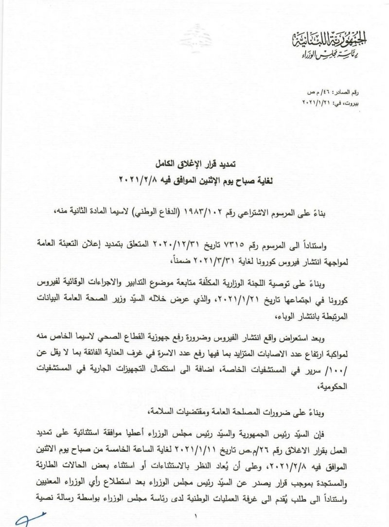 تمديد "قرار" الإغلاق الكامل لغاية صباح يوم الإثنين الموافق فيه ٢٠٢١/٢/٨
