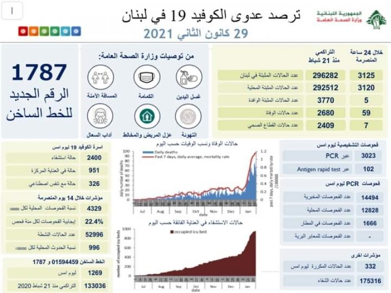 لبنان يسجل 59 حالة وفاة و3125 إصابة جديدة بكورونا خلال الـ24 ساعة الأخيرة