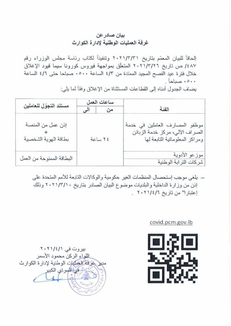 الحاقا للبيان المعمم بتاريخ 31\3\2021 وتنفيذا لكتاب رئاسة مجلس الوزراء رقم 487\ص تاريخ 26\3\2021 المتلعق بمواجهة فيروس كورونا سيما قيود الاغلاق خلال فترة عيد الفصح المجيد الممتدة من 4\3 الساعة 5:00 صباحا حتى 4\6 الساعة 5:00 صباحا.