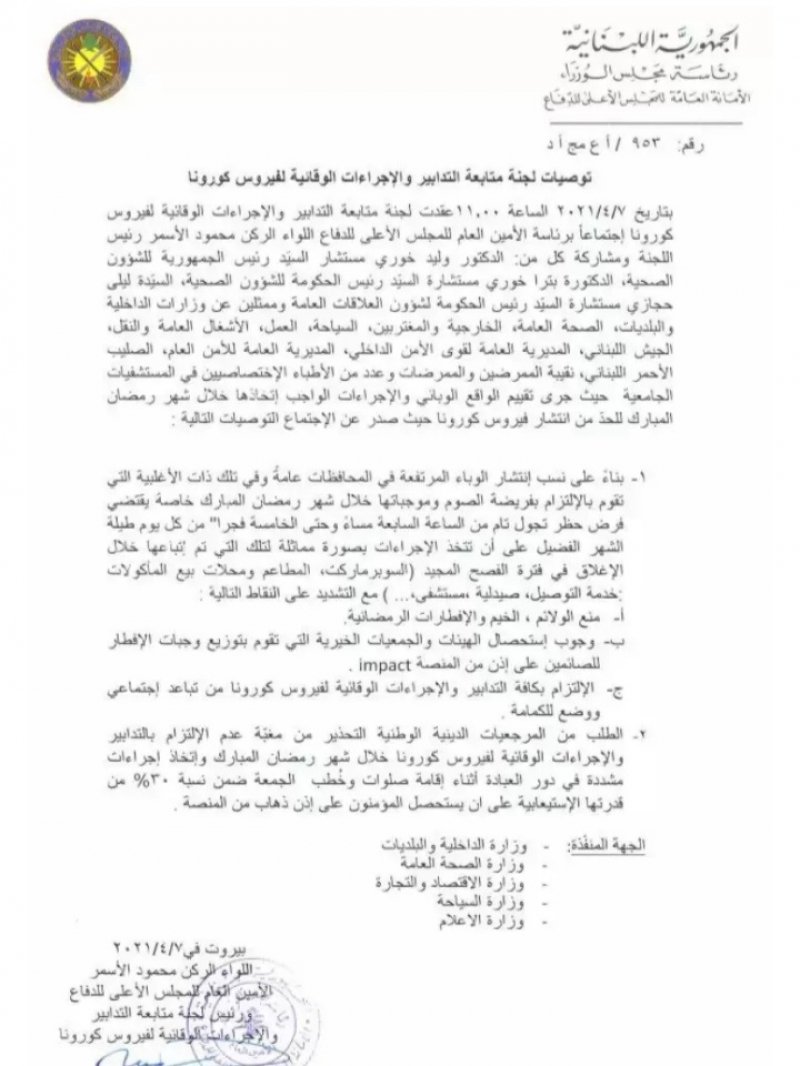 واصدرت توصيات عدة من حظر تجول من الساعة السابعة مساء وحتى الخامسة صباحاً ومنع الولائم والخيم والافطارات الرمضانية، ووجوب استحصال على اذنونات وغيرها.