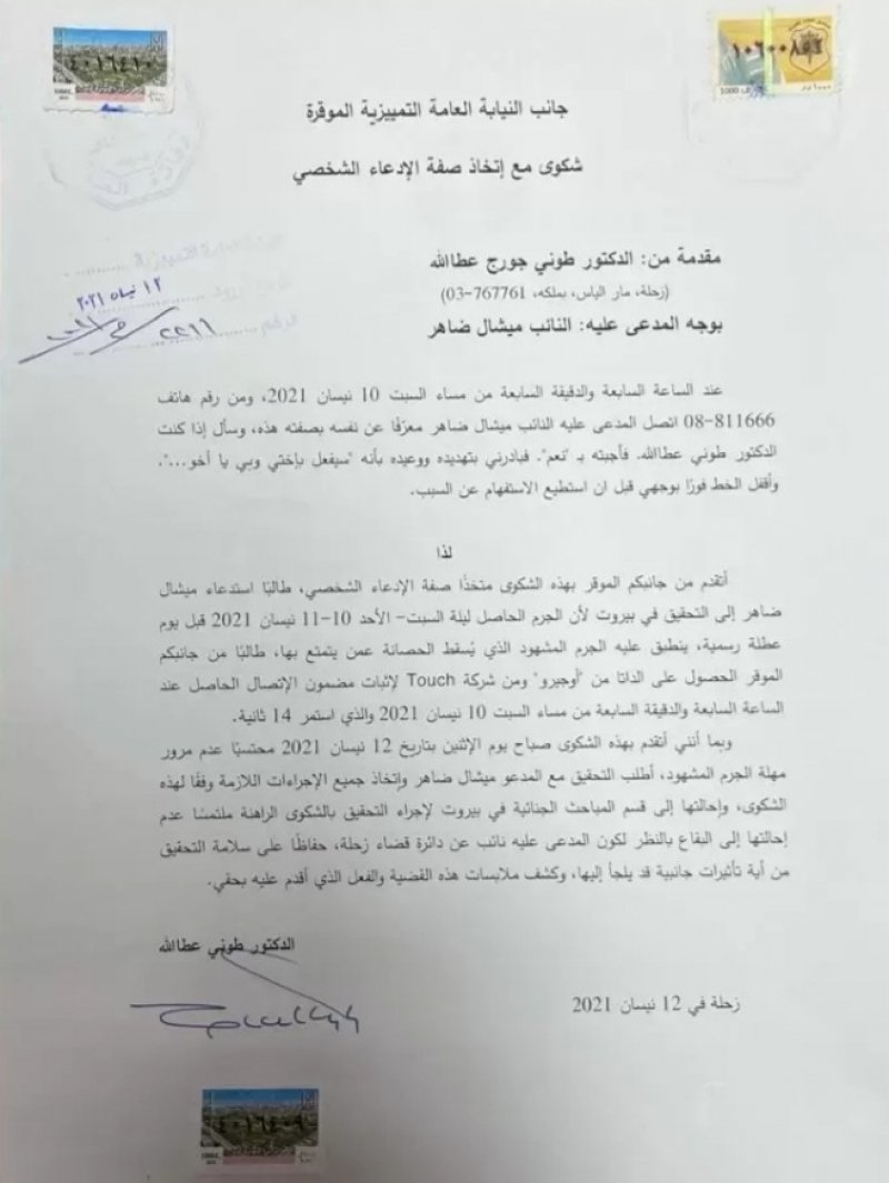 تقدم الدكتور طوني عطاالله، العميد السابق في الجامعة اللبنانية، بشكوى أمام النيابة العامة التمييزية ضد النائب ميشال ضاهر متخذًا صفة الإدعاء الشخصي بجرم التهديد، طالبًا استدعاء المدعى عليه النائب ضاهر للتحقيق معه في الجرم المشهود الذي يُسقط الحصانة عمّن يتمتع بها، ومطالبًا النيابة العامة بالحصول على الداتا من "أوجيرو" وشركة Touch لإثبات مضمون الإتصال الحاصل مساء السبت 10 نيسان 2021.