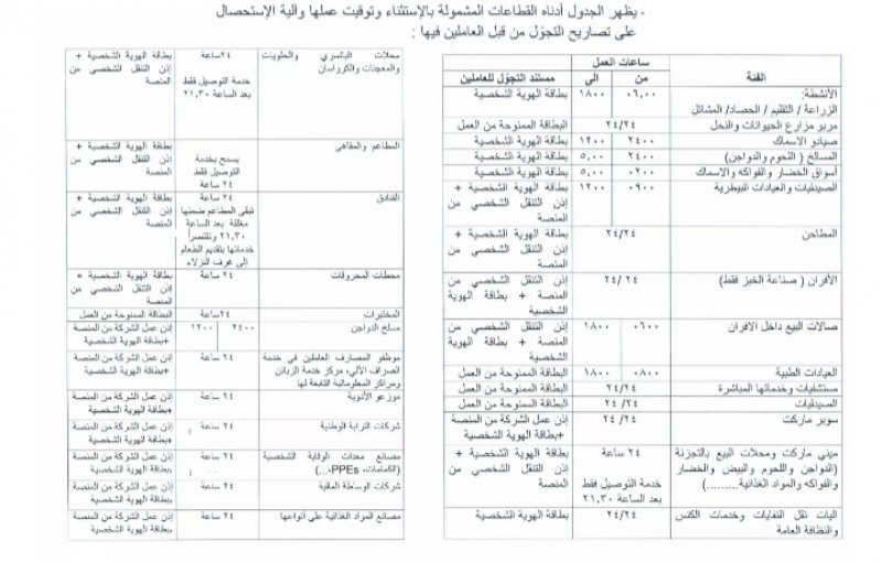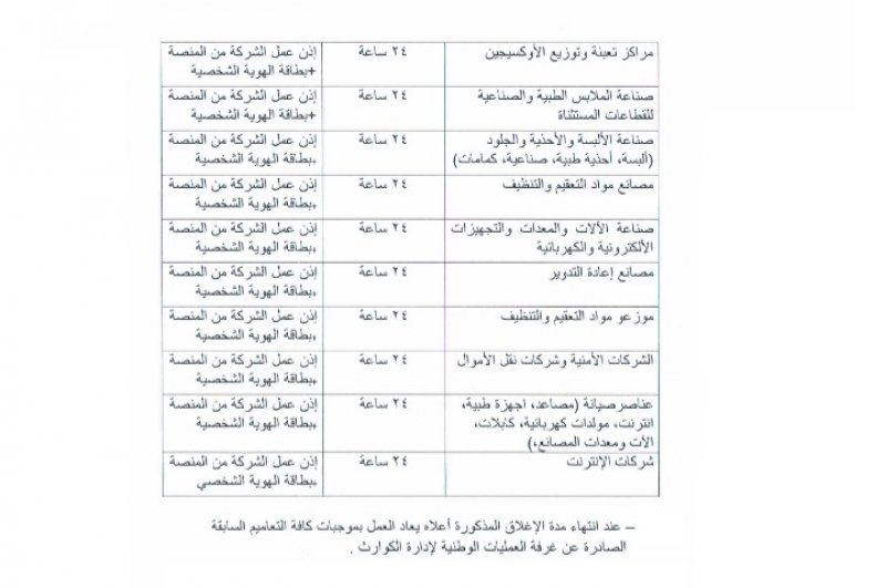 تطبيقاً للقرار الصادر عن غرفة العمليّات الوطنيّة لإدارة الكوارث، الذي يقضي بمنع الخروج والولوج إلى الشوارع والطرقات اعتبارًا من الساعة 5.00 من فجر تاريخ 1-5-2021 حتّى الساعة 5،00 من فجر تاريخ 4-5-2021، ما عدا القطاعات المذكورة في الجدول المرفق ربطاً والتي يُسمح لها بالعمل خلال هذه المدّة.