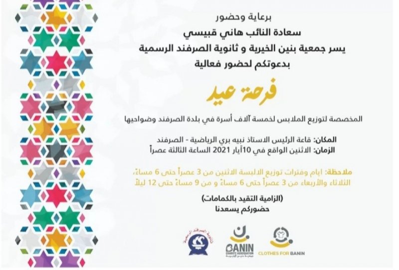 دعت جمعية بنين الخيرية الاهالي في بلدة الصرفند والجوار للمشاركة في إطلاق فعاليات "فرحة العيد". وستباشر الجمعية توزيع الثياب ضمن برنامجها متابعًة لحملة "قطعة منك بتدفي قلب".