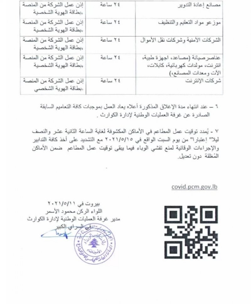 أما بالنسبة للمطاعم، فيُمدد عمل المطاعم في الاماكن المكشوفة لغاية الساعة الثانية عشر والنصف ليلاً اعتبارا من السبت 15 ايار مع التشدد في اخذ كافة التدابير والاجراءات الوقائية، فيما يبقى توقيت عمل المطاعم ضمن الاماكن المغلقة دون تعديل.