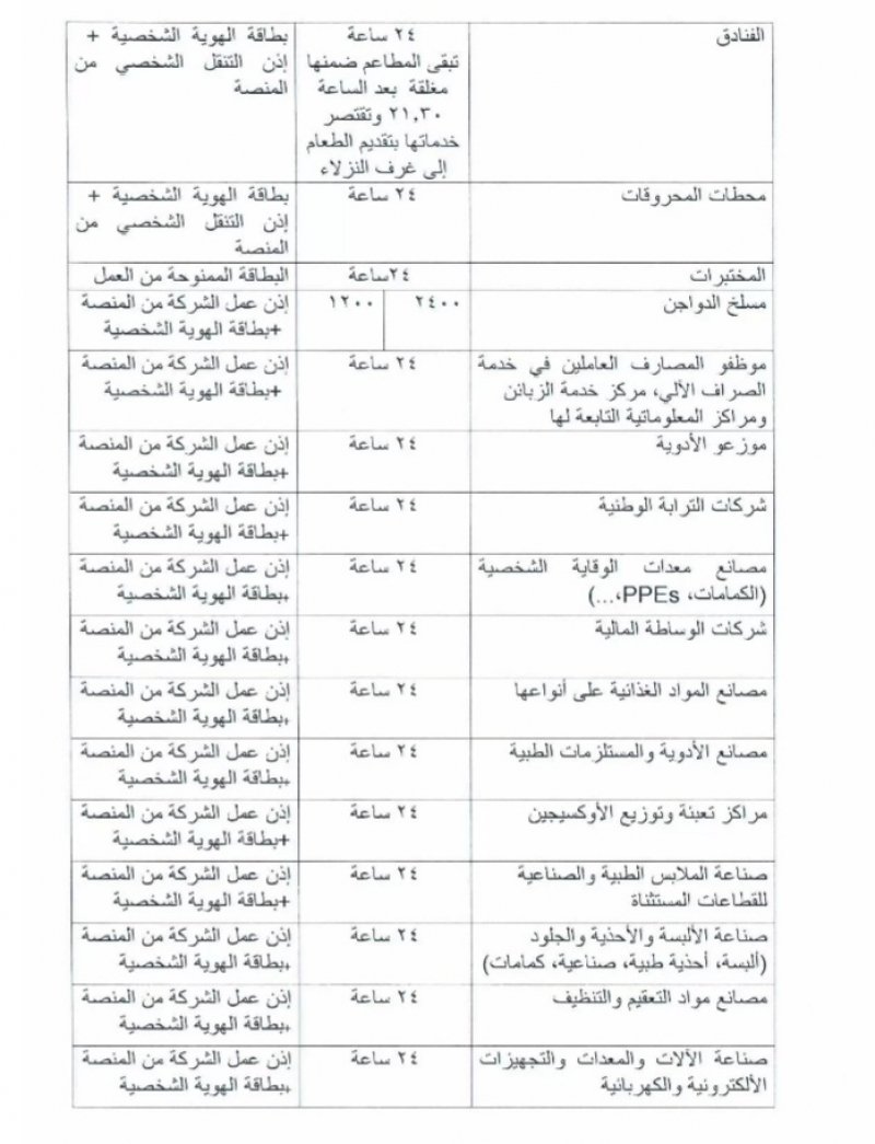 وبحسب البيان، يُمنع الخروج والولوج الى الشوارع والطرقات اعتباراً من الساعة الخامسة من صباح اول ايام عيد الفطر ولمدة يومين حيث يحصر التجول خلال هذه المدة بالاشخاص الذين تم استثناؤهم وللأشخاص الذين لا يشملهم الاستثناء الخاضعين لقرار الاغلاق بعد حصولهم على اذن تنقل.