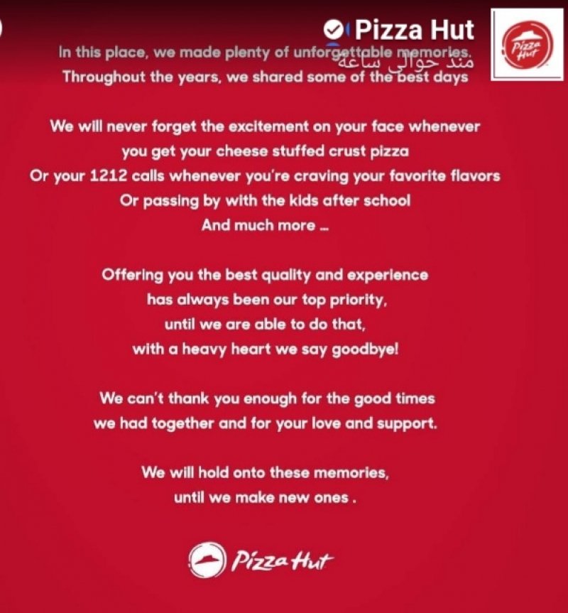 أعلنت متاجر "بيتزا هت" في لبنان الإقفال نهائياً، مودّعة زبائنها وعملائها الذين واكبوها طوال السنوات الماضية.