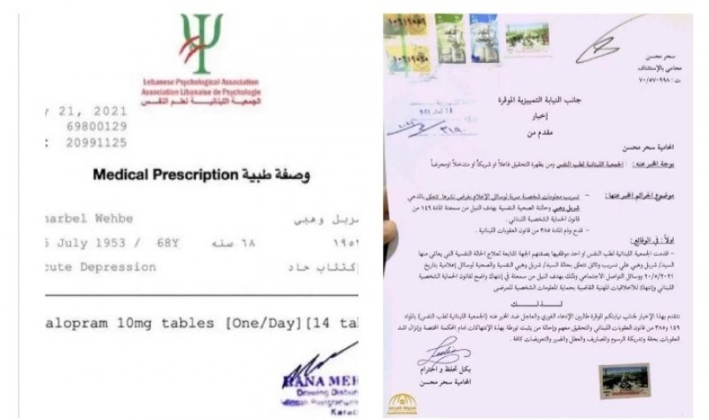 وعلى الفور تقدم الأخير عبر المحامية سحر محسن بإخبار لدى النيابة التمييزية ضد الجمعية اللبنانية لطب النفس بجرم تسريب وثائق شخصية لوسائل الإعلام لنشرها بهدف النيل من سمعة وهبي. ولفتت إلى أنه "انتهاك واضح لقانون الحماية الشخصية اللبناني وانتهاك الأخلاقيات المهنية القاضية بحماية المعلومات الشخصية للمرضى".