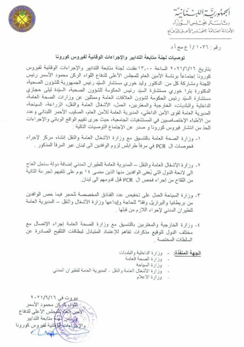 2- وزارة الاشغال العامة والنقل- المديرية العامة للطيران المدني إضافة دولة ساحل العاج إلى لائحة الدول التي يُعفى الوافدون منها الذين مضى 14 يوم على تلقيهم الجرعة الثانية من اللقاح من إجراء فحص الـpcr قبل قدومهم إلى لبنان.