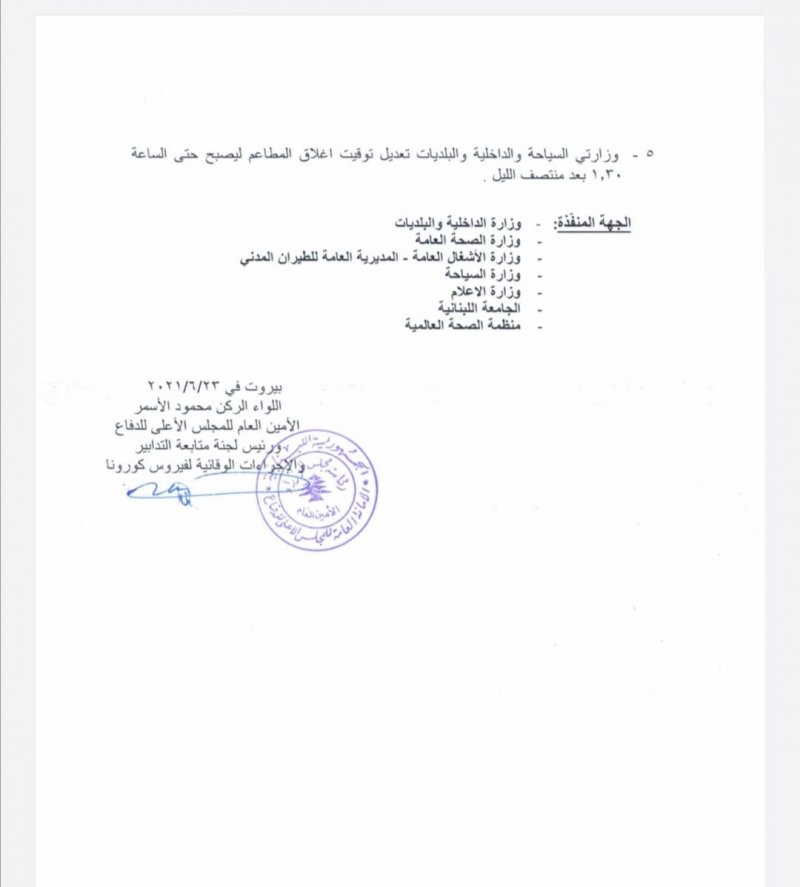 أصدرت لجنة متابعة التدابير والاجراءات الوقائية لفيروس كورونا مجموعة توصيات ابرزها متمثل في تعديل توقيت اغلاق المطاعم ليصبح حتى الساعة الواحدة والنصف من بعد منتصف الليل.