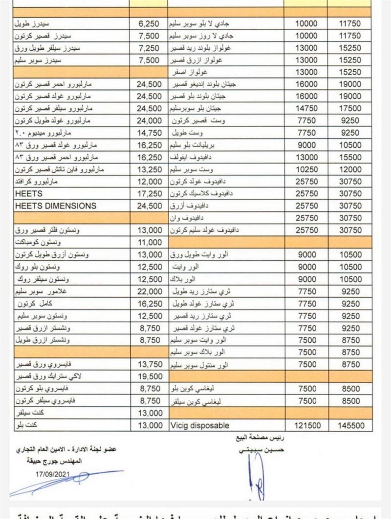 أصدرت إدارة حصرالتبغ والتنباك اللبنانية، لائحة بأسعار مبيع كل السجائر والمعسّل، وشهدت انخفاضاً طفيفاً شمل مختلف الأصناف، وهي الشكل الآتي: