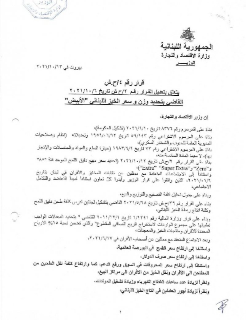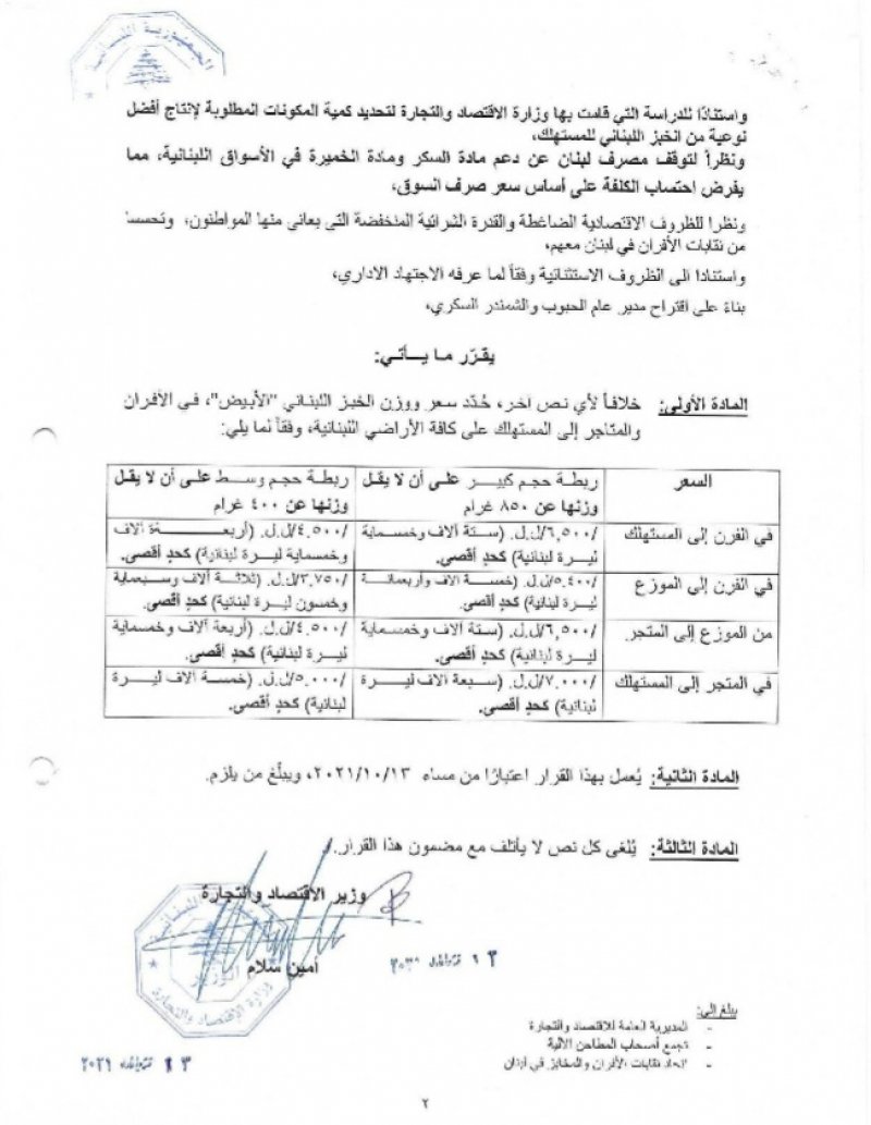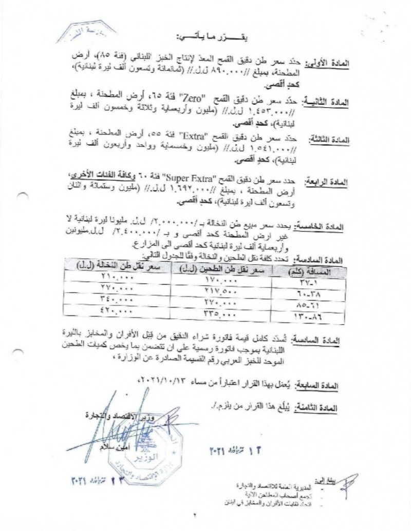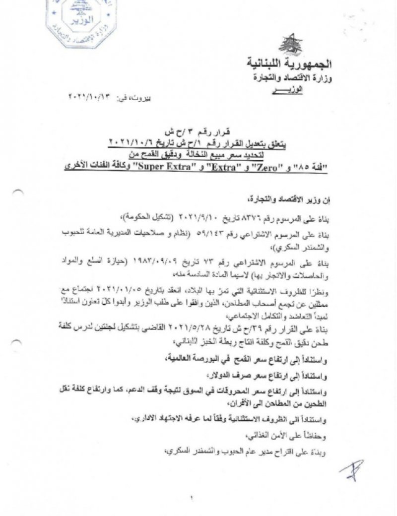 "أصدر وزير الاقتصاد والتجارة أمين سلام قرارين، الأول يتعلق بتحديد سعر مبيع النخالة ودقيق القمح من "فئة 85" و"zero" و "extra" و"super extra" وكافة الفئات الأخرى، والثاني يقضي بتحديد وزن وسعر الخبز اللبناني الأبيض.