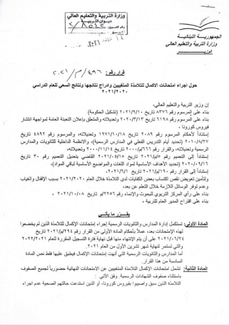 أصدر وزير التربية والتعليم العالي عباس الحلبي القرار رقم 496/م/2021 حول إجراء امتحانات الإكمال للتلامذة المتغيبين وإدراج نتائجها ونتائج السعي للعام الدراسي 2020-2021. وجاء في القرار: