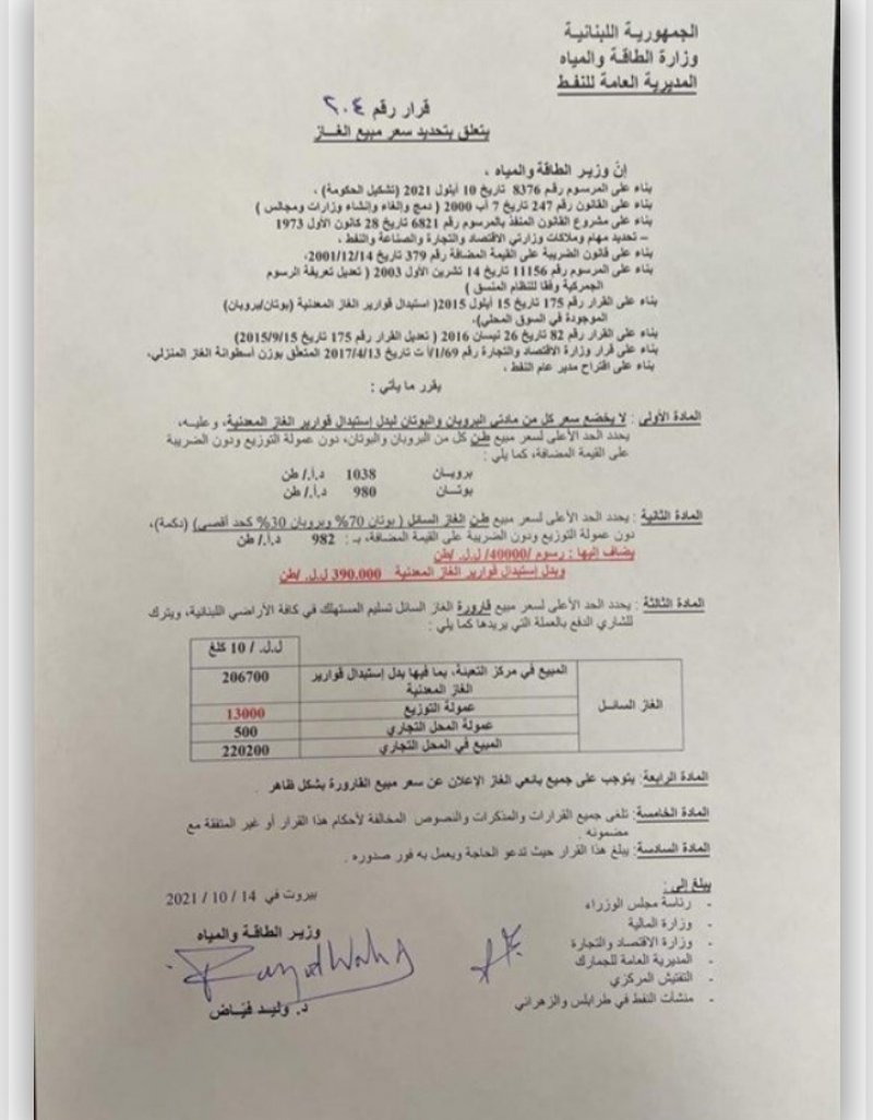 "أصدرت وزارة الطاقة والمياه قرارا حدّدت فيه سعر مبيع قارورة الغاز بـ220200 ليرة.