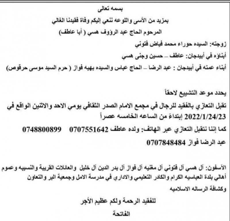 بمزيد من الاسى واللوعة والتسليم بقضاء الله ننعي اليكم وفاة فقيدنا الغالي فقيد الإغتراب المرحوم الحاج عبد الرؤوف هسي (أبو عاطف) ابن بلدة العباسية الجنوبية الذي توفاه الله صباح الأحد ٢٠٢٢/١/٢٣ في أبيدجان عاصمة ساحل العاج .