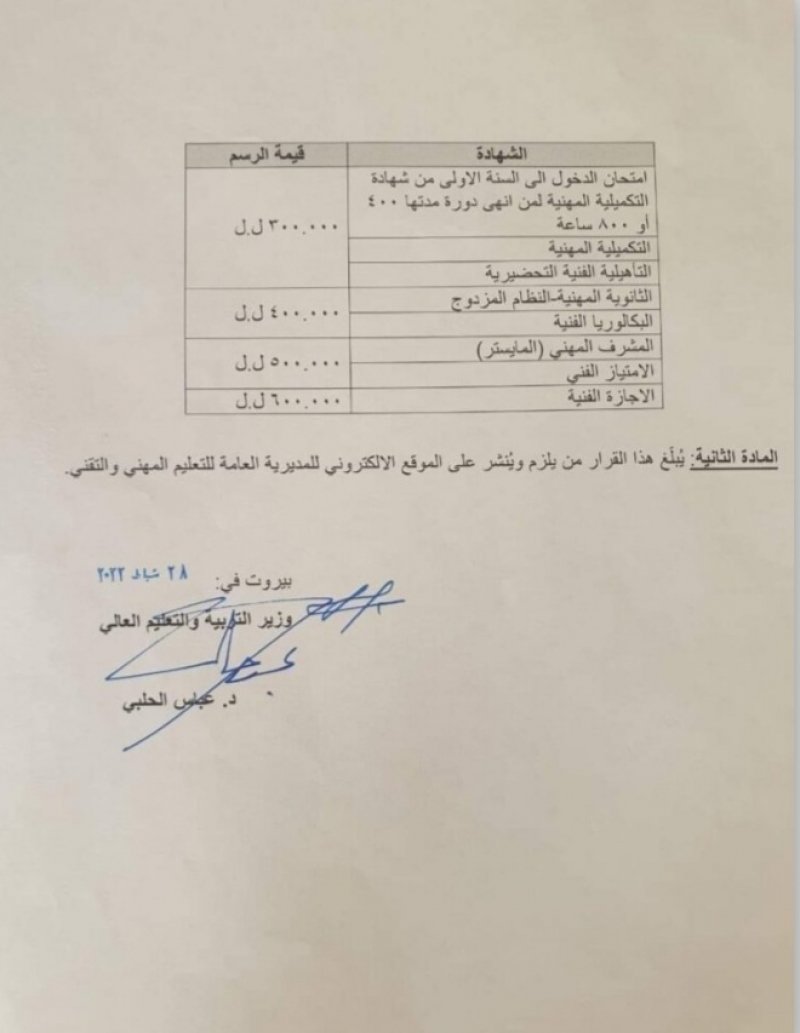 "أعلنت وزارة التربية والتعليم العالي عن زيادة رسوم الترشيح للإمتحانات المهنية الرسمية للعام 2022 بنسبة 7 أضعاف على الشكل التالي :